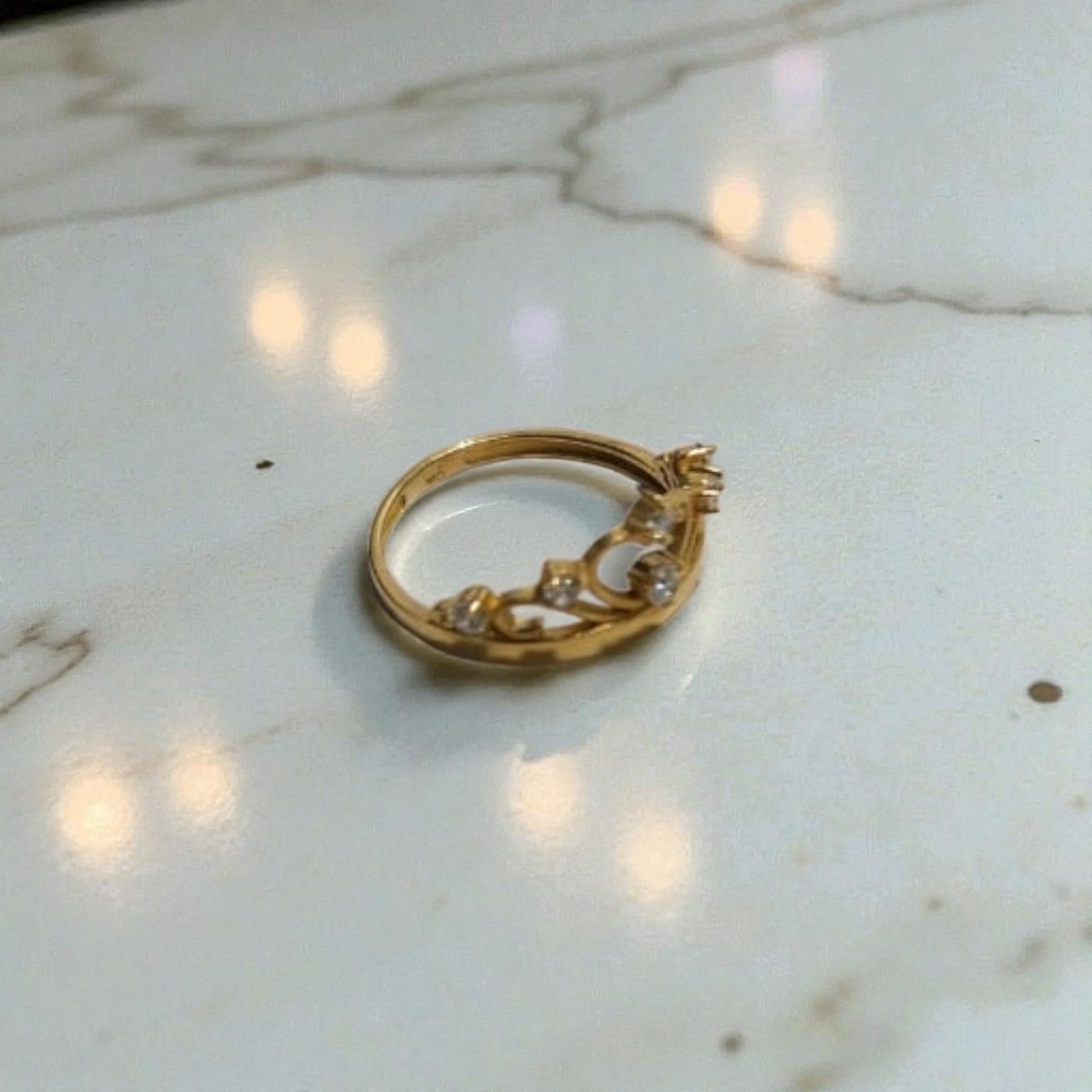 Este anillo corona, forjado en oro 18K y con un peso de 2,6 gramos, abraza la mano con la majestuosidad de lo sutil.