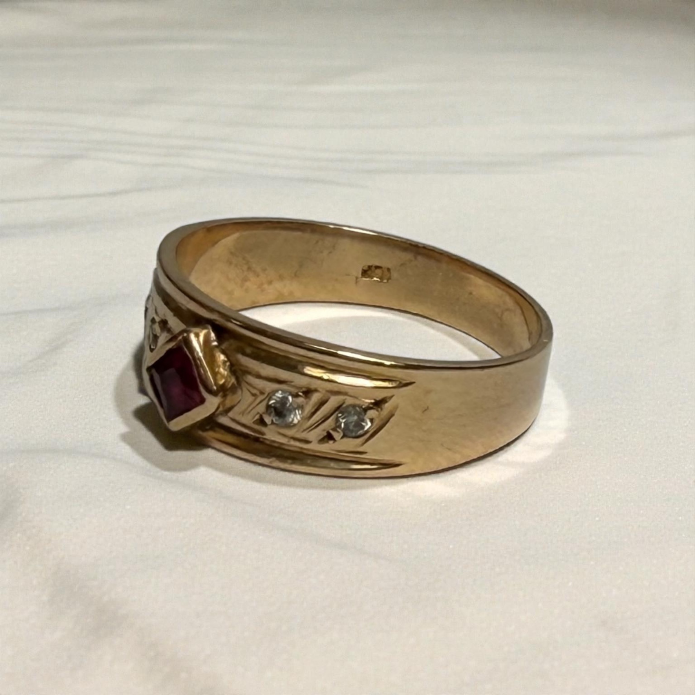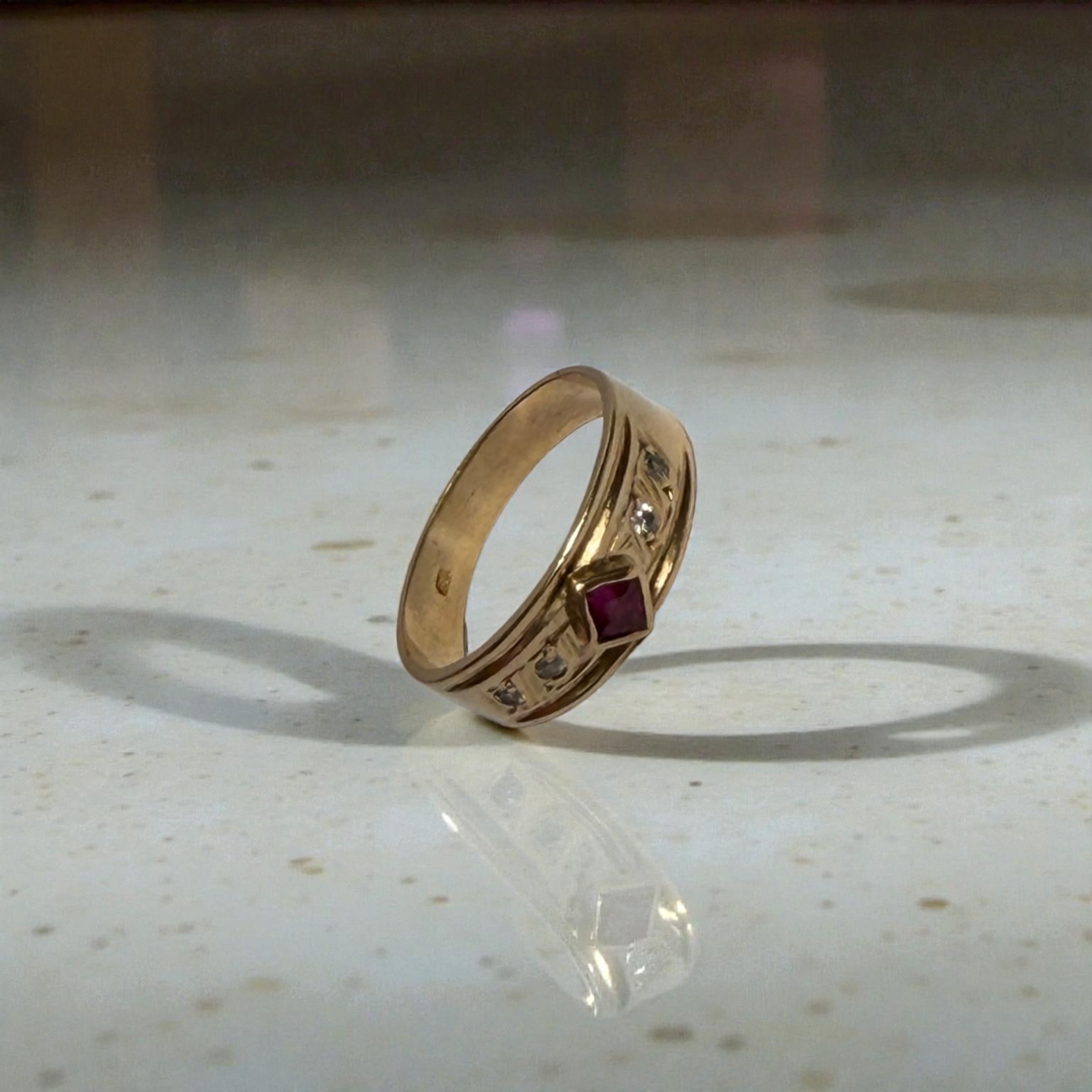 Un diseño sólido y sofisticado. Este anillo en oro 18 kilates, con un peso de 4,5 gramos, destaca por su rubí central corte cuadrado, acompañado de circones laterales que aportan luz y un equilibrio perfecto al diseño. Su aro ancho y pulido ofrece una presencia elegante, ideal para quienes buscan una joya firme, distinguida y con carácter.