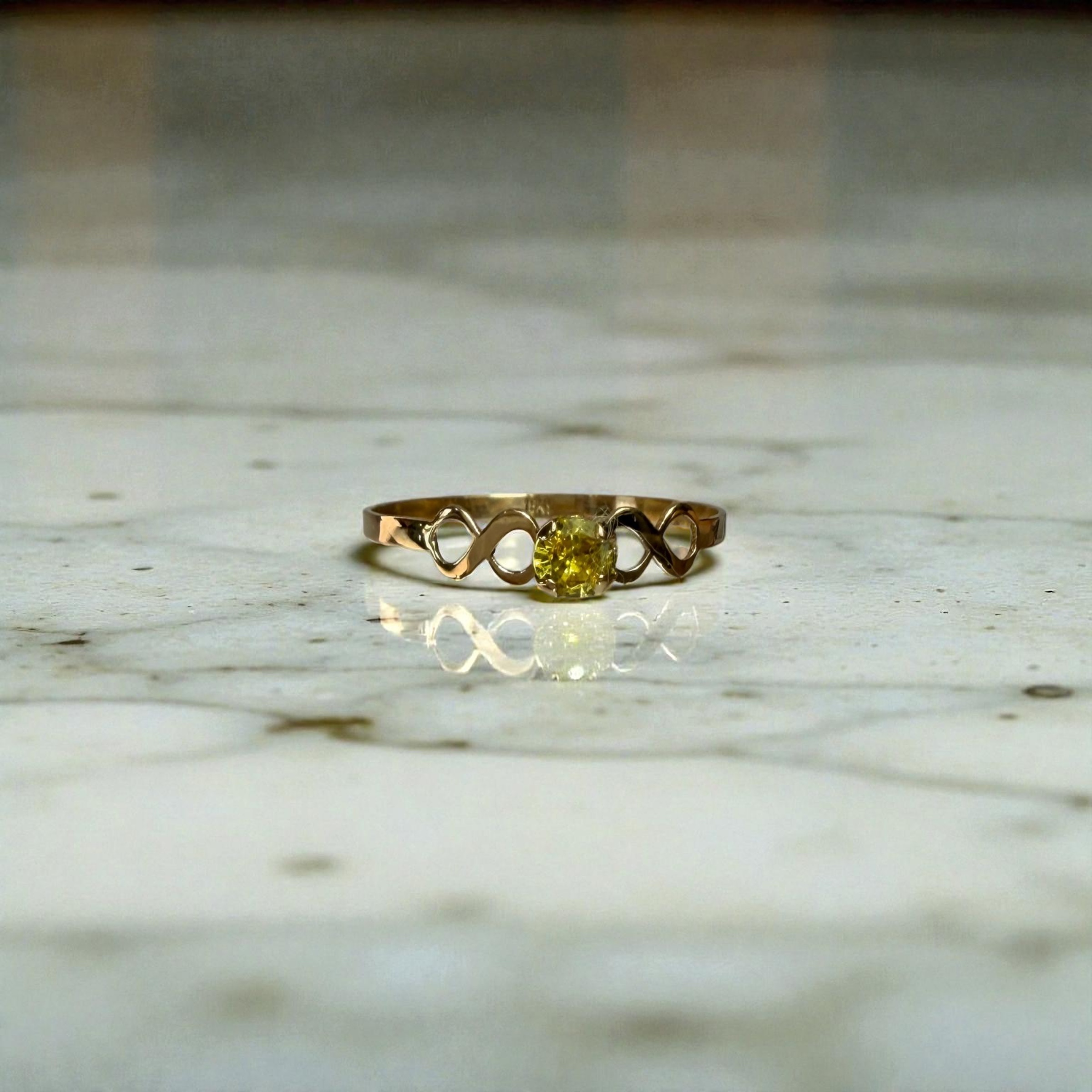 Un diseño delicado y lleno de significado. Este anillo, elaborado en oro 18 kilates, presenta dos símbolos de infinito que enmarcan una brillante piedra amarilla al centro, creando un contraste luminoso y sofisticado. Con un peso de 0,7 gramos, es una pieza fina, ligera y cómoda para el uso diario, ideal para quienes buscan elegancia sutil con un toque de color.