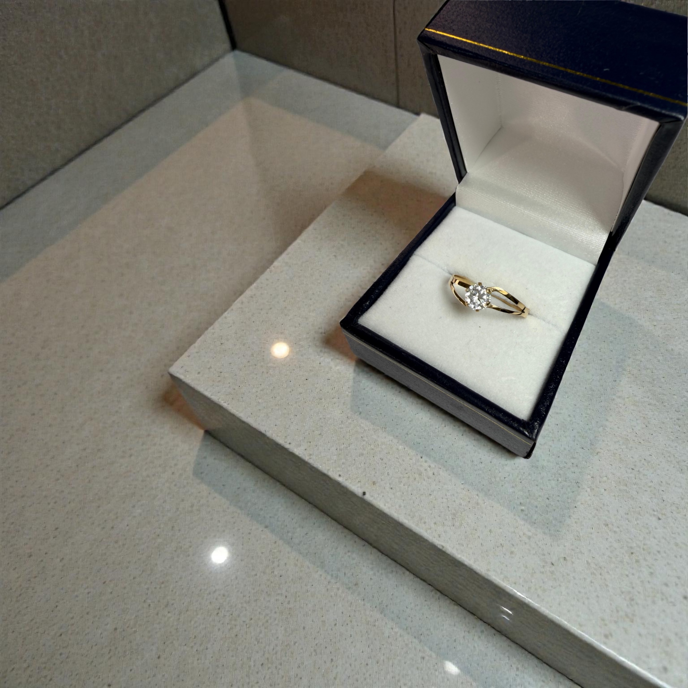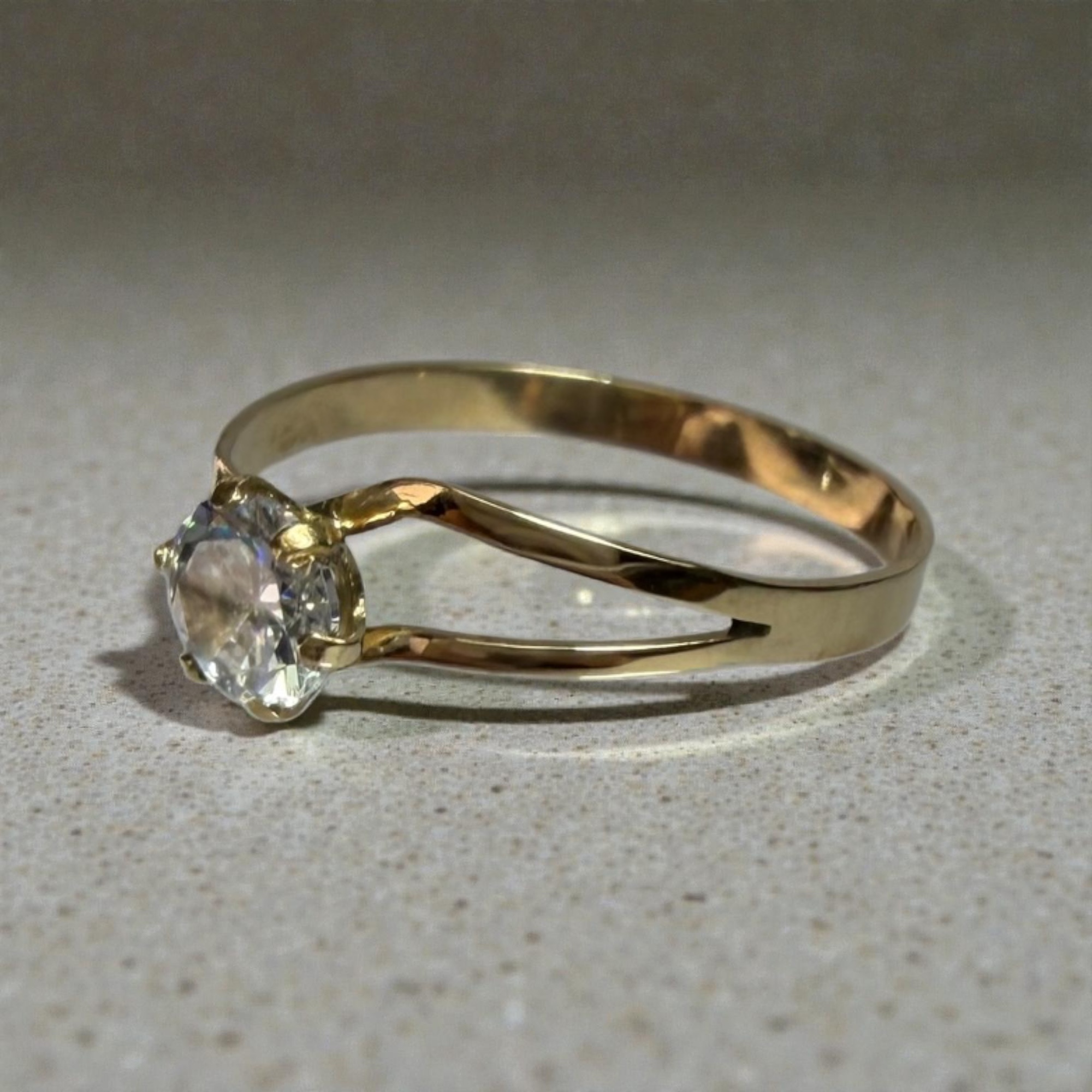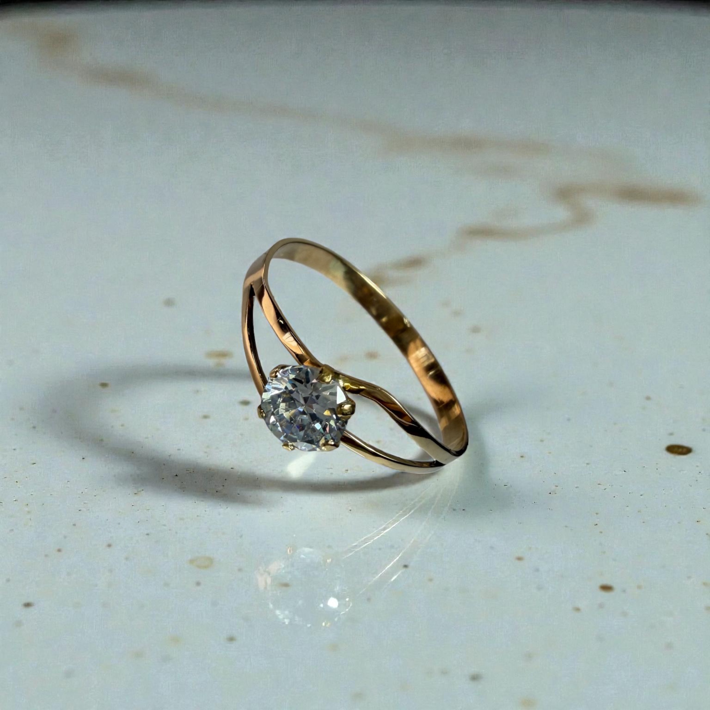 Un diseño refinado y luminoso. Este anillo solitario en oro 18 kilates, con un peso de 2,20 gramos, destaca por su piedra central corte redondo montada sobre una estructura abierta que le otorga mayor brillo y una presencia delicada. Sus líneas delgadas y su acabado pulido crean un equilibrio perfecto entre elegancia y simplicidad, ideal para quienes buscan una joya clásica con un toque moderno.