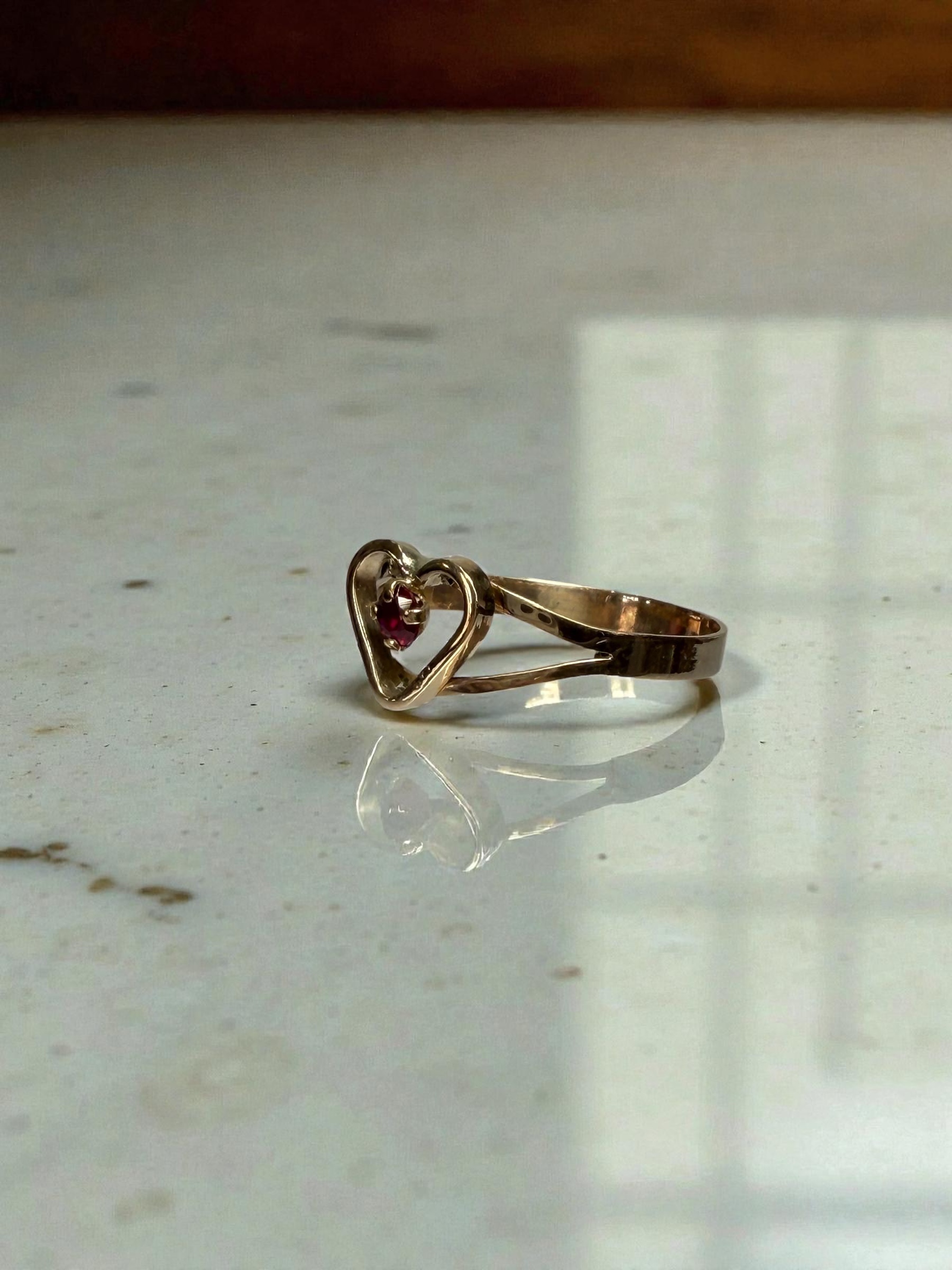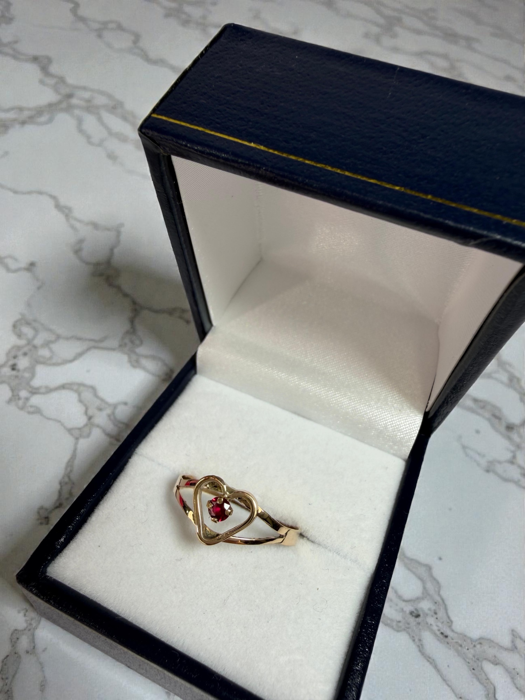 Un diseño romántico y delicado. Este anillo en oro 18 kilates, de 1,6 gramos, destaca por su estructura en forma de corazón que enmarca una piedra roja central, creando un contraste cálido y lleno de vida. Su acabado pulido y su forma estilizada le otorgan un brillo suave y una presencia femenina y encantadora.