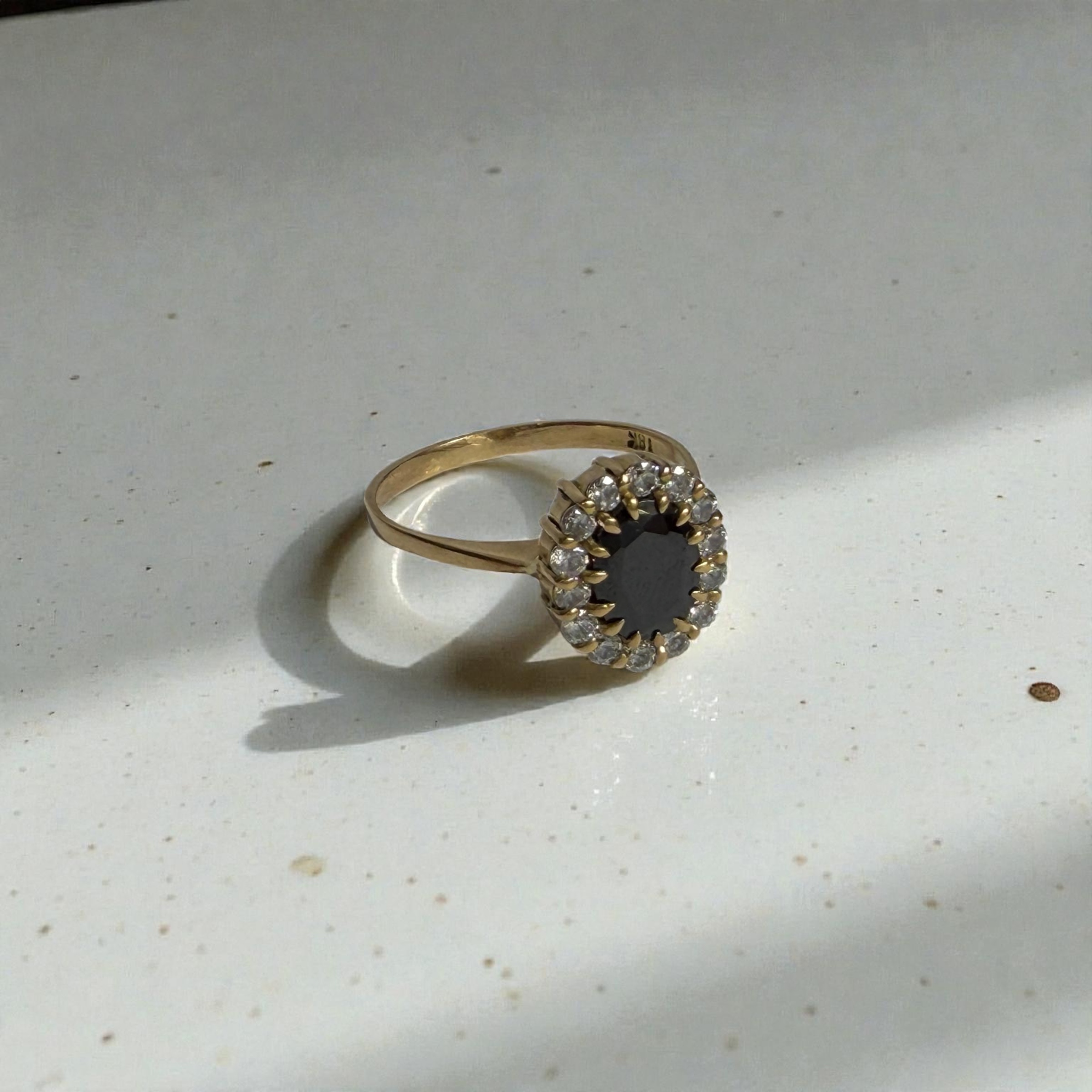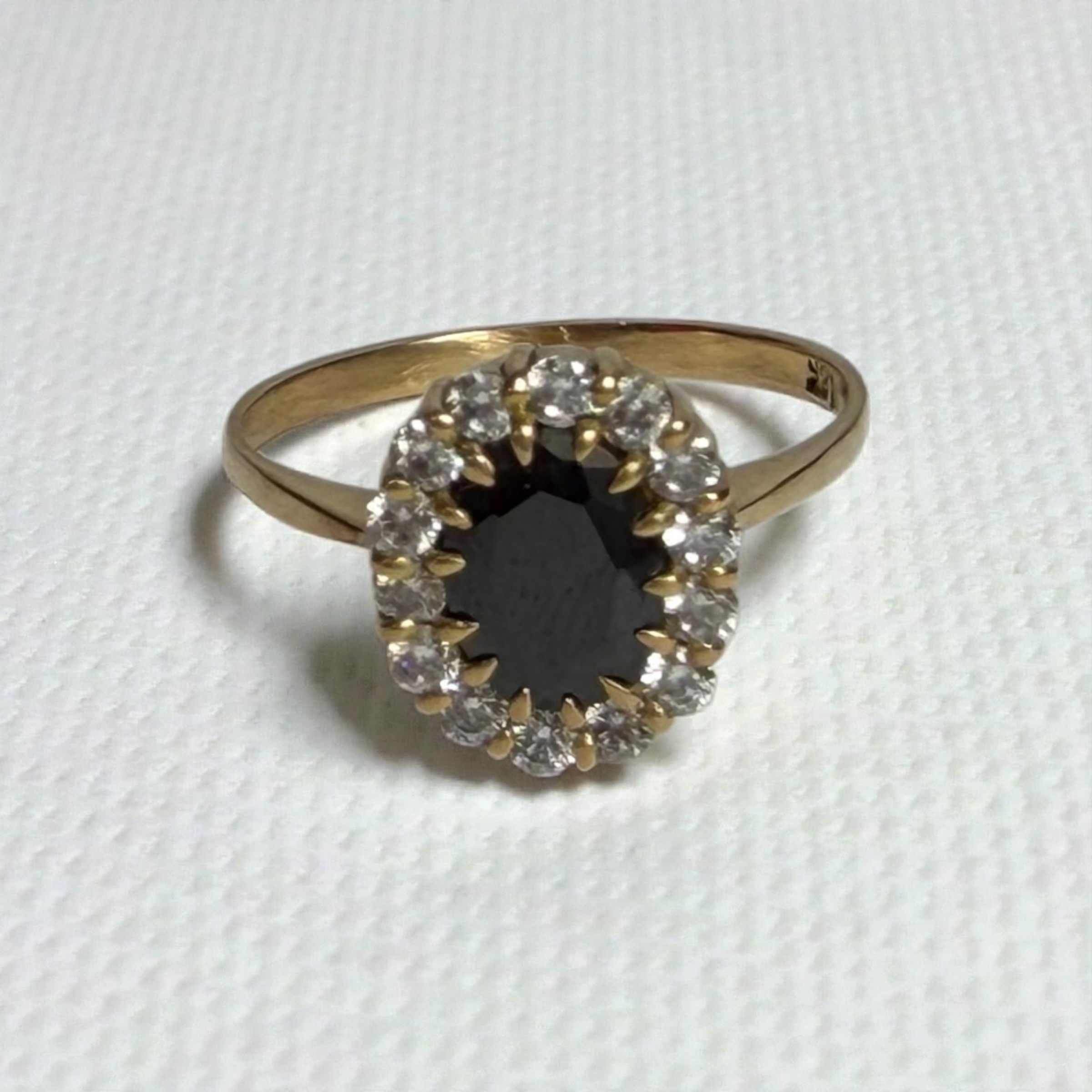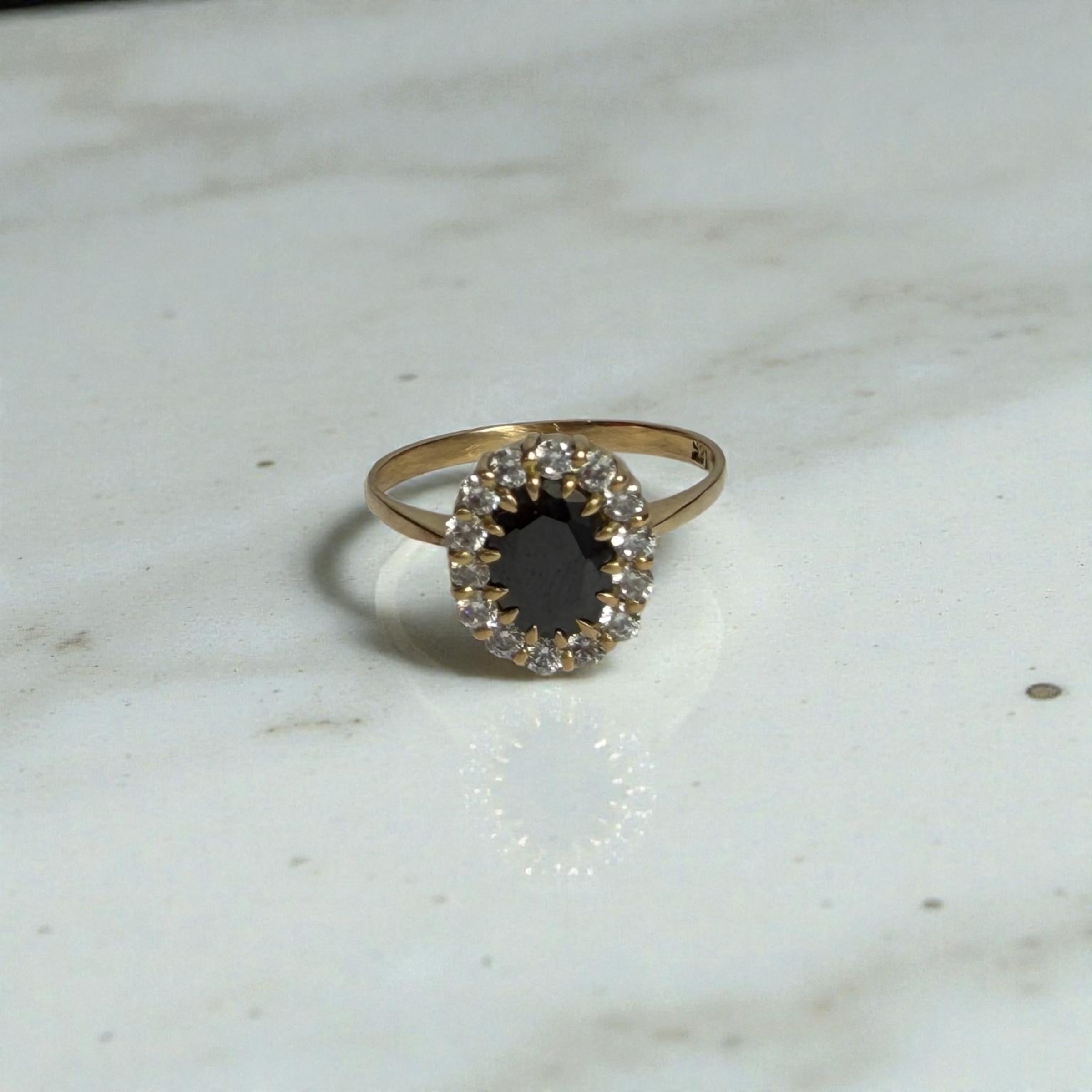 Un diseño clásico y sofisticado. Este anillo en oro 18 kilates, con un peso de 4,3 gramos, presenta una piedra central negra corte oval, rodeada por un elegante halo de brillantes que realza su contraste y profundidad. Su aro delgado y pulido aporta delicadeza, logrando una pieza imponente pero equilibrada.