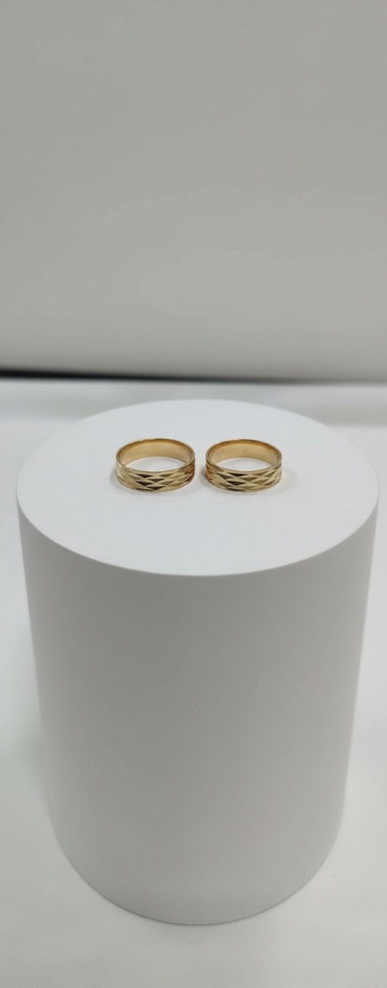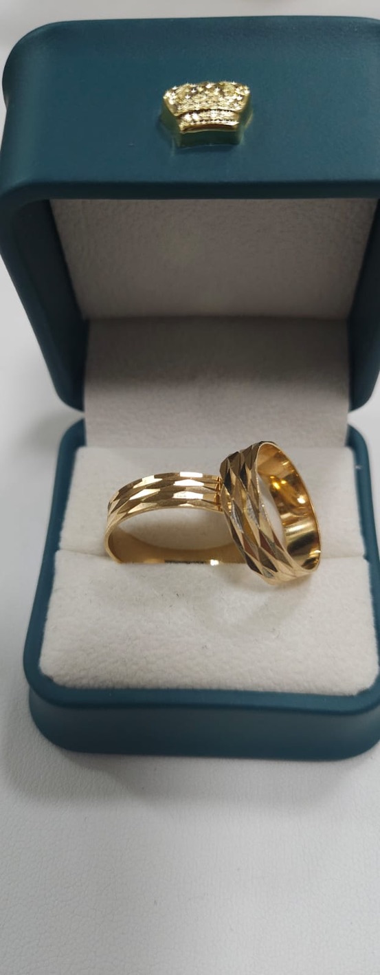 Estas argollas de matrimonio, elaboradas en oro 18 quilates, destacan por su corte diamante, un trabajo facetado que realza al máximo el brillo y la elegancia en cada movimiento. Con un peso total de 5 gramos y un ancho de 5 mm, ofrecen una presencia clásica, firme y sofisticada, perfectas para simbolizar un compromiso eterno.