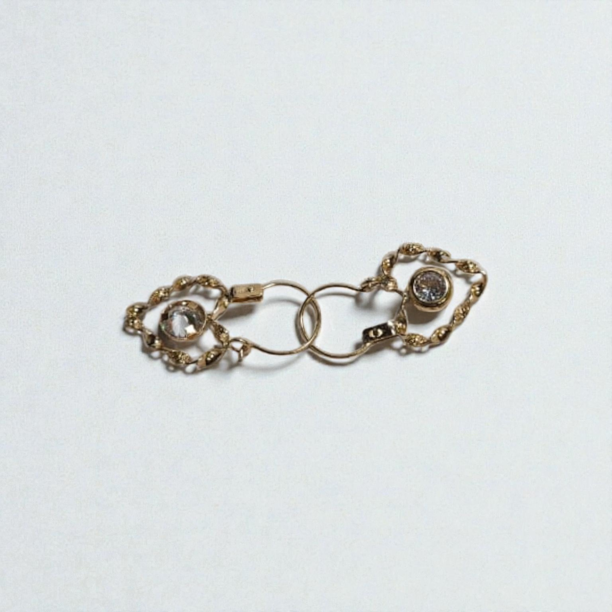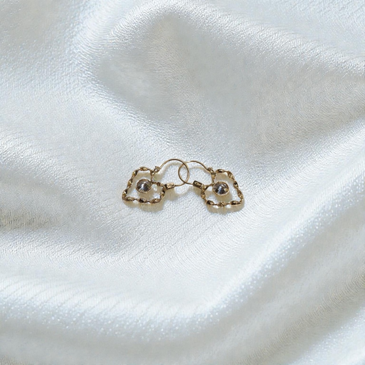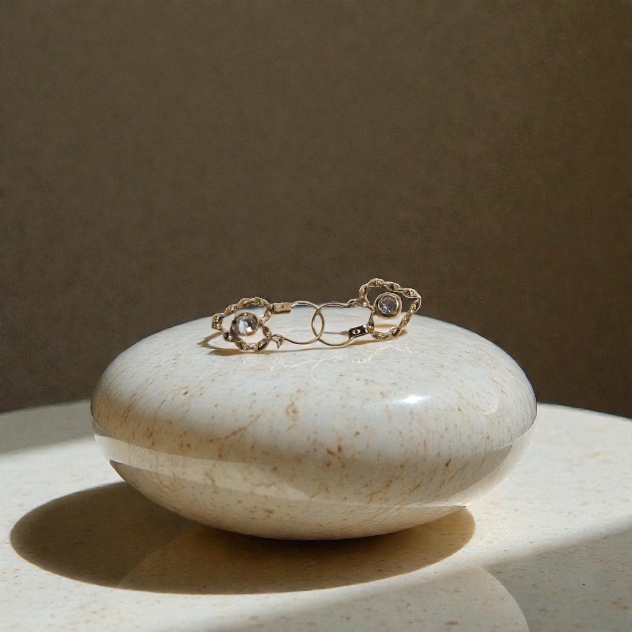 Elegantes aros de oro 18K con diseño torcido y una piedra central que realza su brillo natural. Su acabado fino los convierte en el complemento perfecto para un look sofisticado y atemporal.