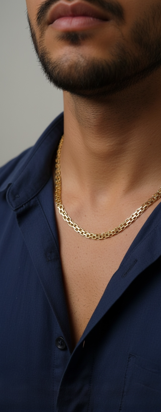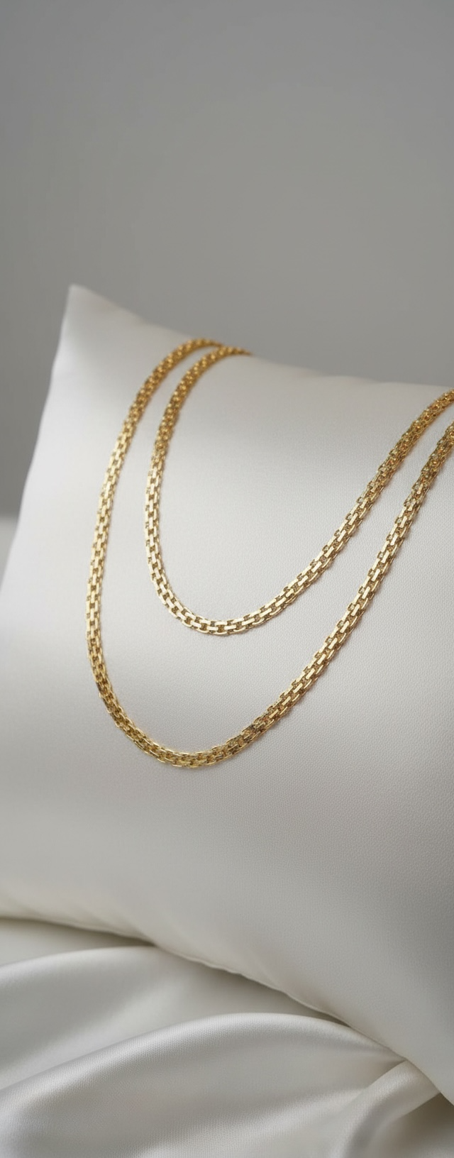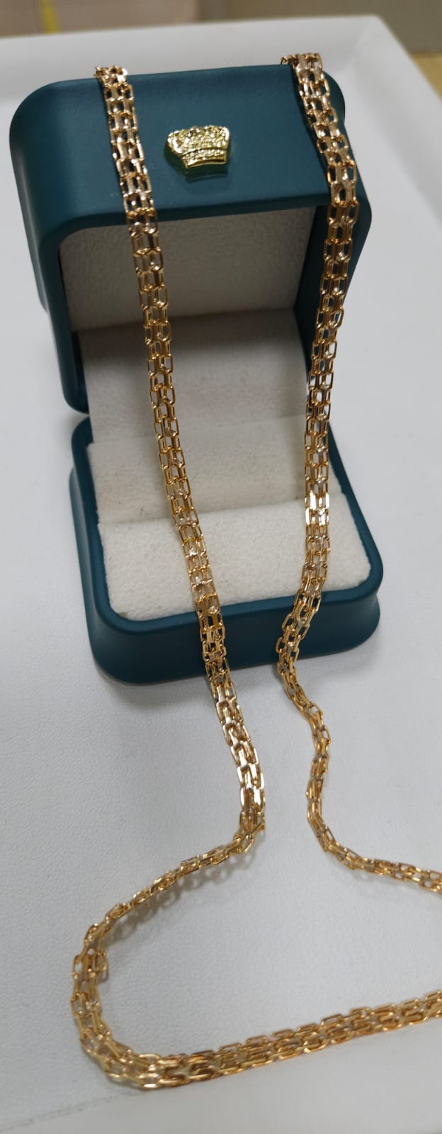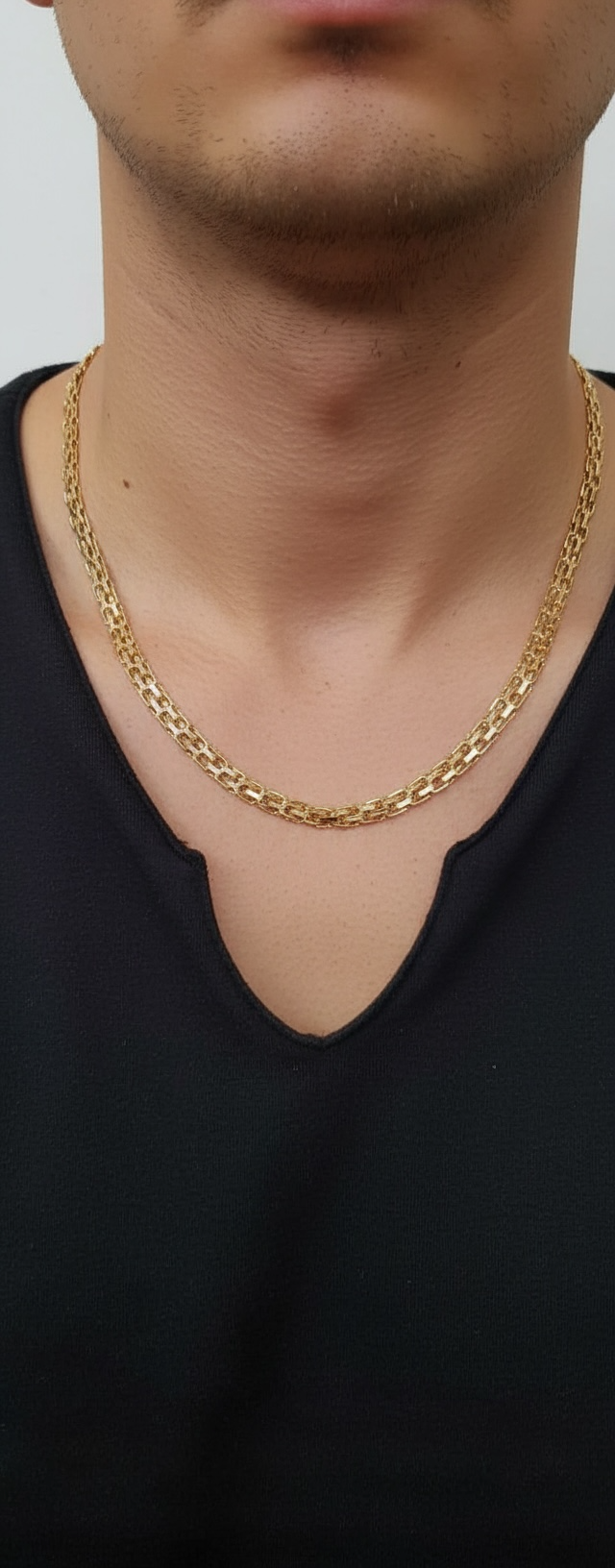 Esta cadena de tejido chino destaca por su diseño firme y sofisticado, ideal para quienes buscan una joya con carácter, brillo uniforme y excelente resistencia. Su entramado clásico realza el oro y aporta una presencia elegante tanto para uso diario como para ocasiones especiales.